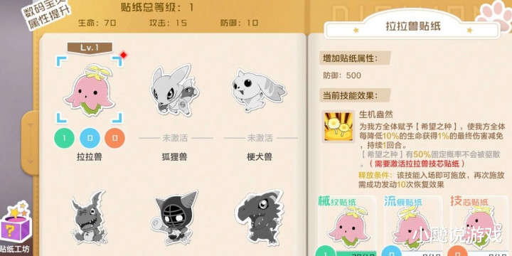前期无谓纠结专属贴纸的品性,非论是高星依然低星,先把能解锁的贴纸都激活,要点升级贴纸品级 —— 哪怕是劣品性贴纸,升级后给全队加的属性也很可不雅,比单堆一只数码兽的专属贴纸更高效;工坊刷新也偶然期,别傻傻等 1 小时自动刷新,集皆现时轮 3 个贴纸就坐窝开下一轮,既能快速晋升工坊品级,又能攒更多贴纸碎屑用于升级;
