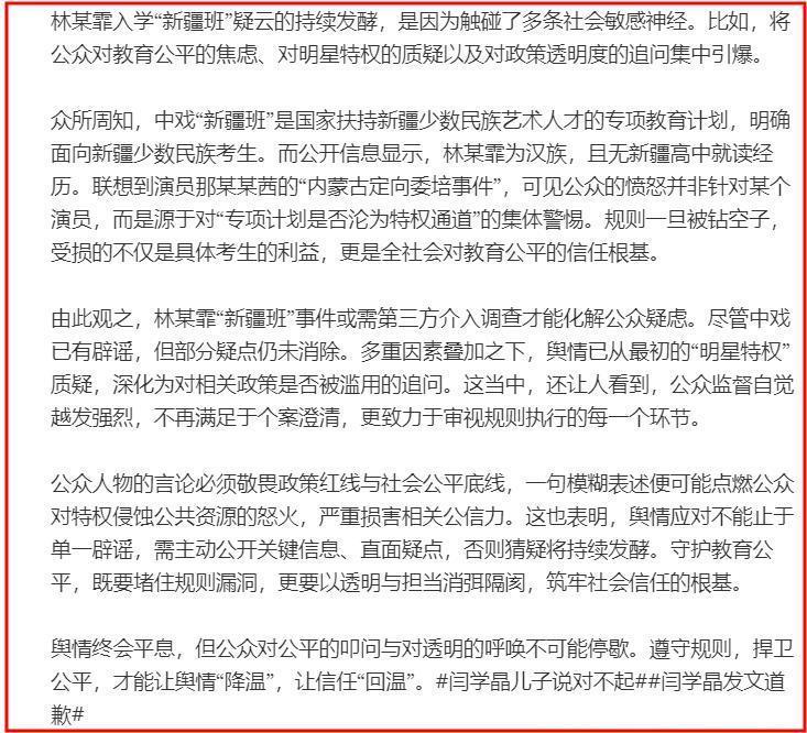 此外,东谈主民网还有益强调,此次“公众的震怒并非针对某个演员,而是源于对‘专项议论是否沦为特权通谈’的集体警惕。顺次一朝被钻空子,受损的不仅是具体考生的利益,更是全社会对考验公谈的信任根基。”