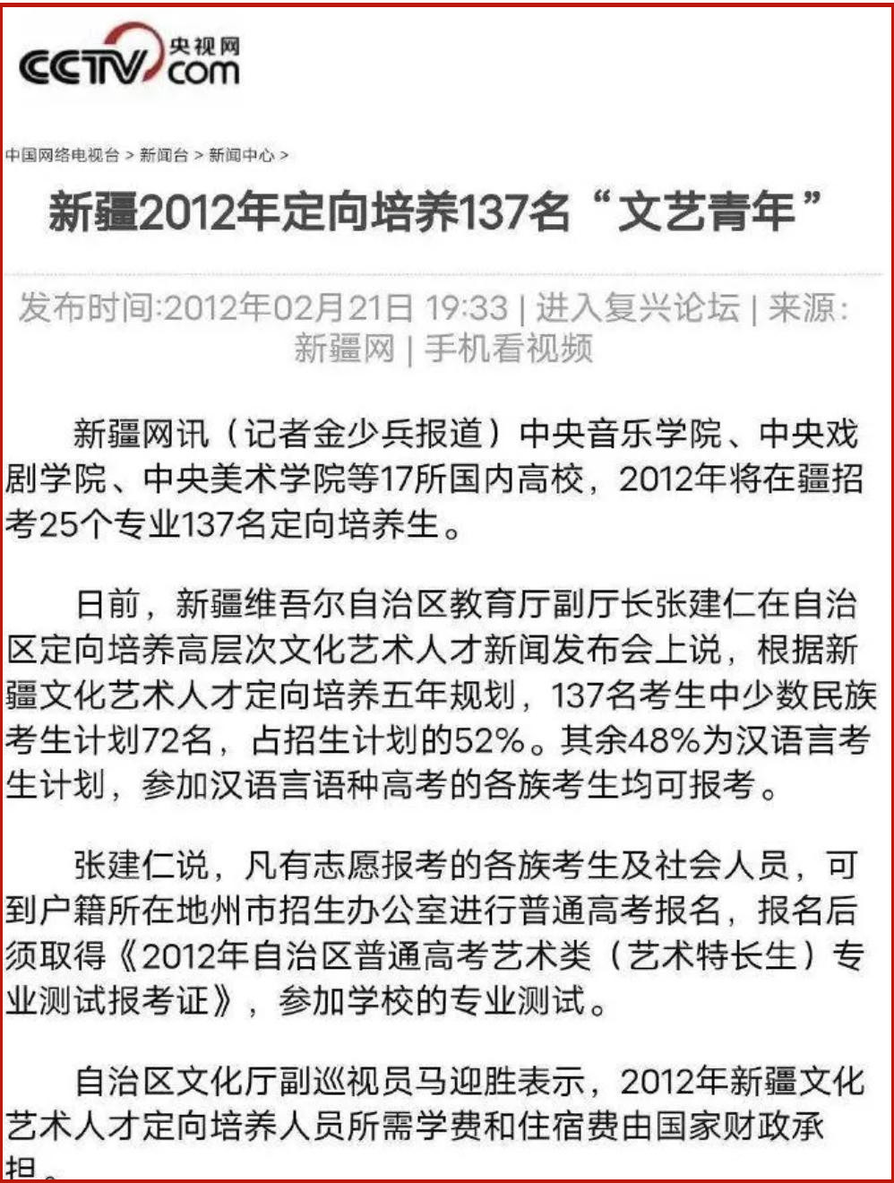从央视网的报谈中不错看到,2012年,中央音乐学院、中央戏剧学院、中央好意思术学院等17所国内高校在新疆招考25个专科,137名定向培养生。