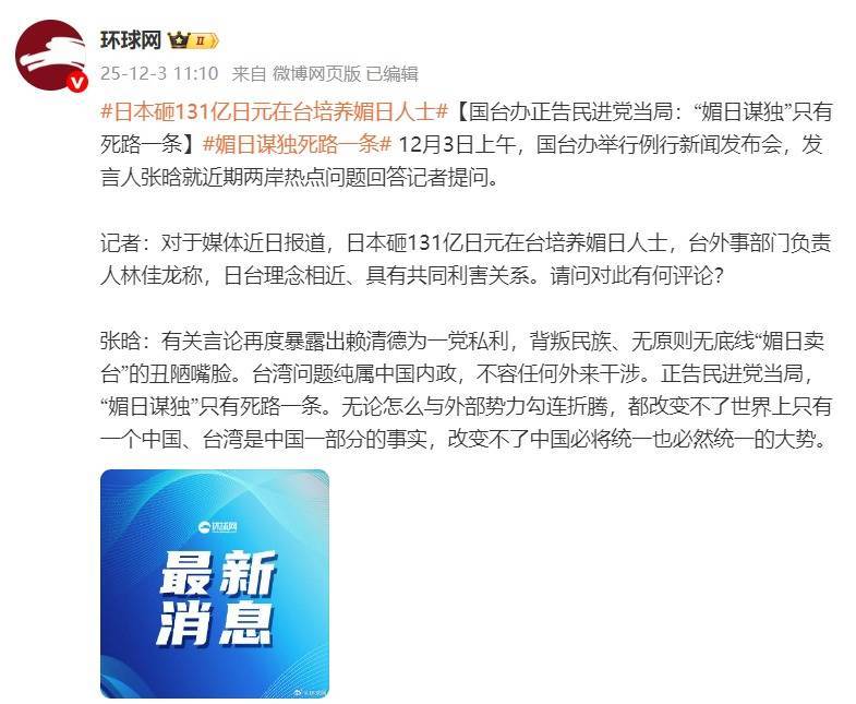 记者:关于媒体近日报说念,日本砸131亿日元在台培养媚日东说念主士,台外事部门稳当东说念主林佳龙称,日台理念邻近、具有共同横蛮干系。求教对此有何辩驳?