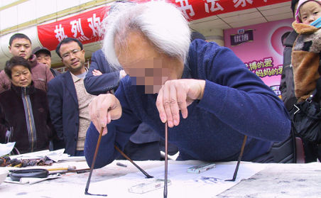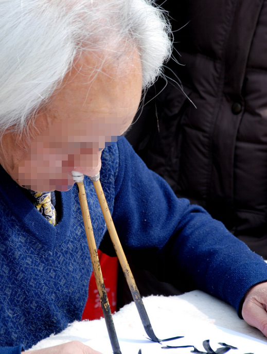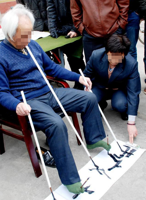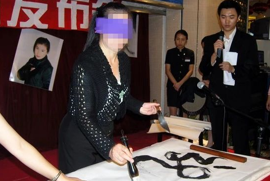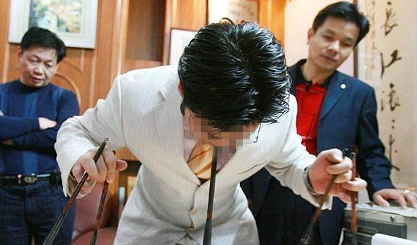 现代江湖书道:主动追求技法夸张,如「吼书」「射书」等杂耍式扮演,或刻意歪曲字形(如将「马」书画成马形),以视觉冲击替代书道内涵。脱离传统笔法,常出现拖笔、扫笔等非法运笔,线条扁薄无力,结构失衡。